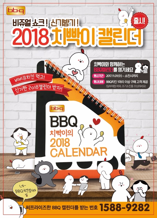 이미지 확대보기BBQ가 다가오는 2018년을 맞아 ‘BBQ 2018 치빡이 캘린더’ 증정 이벤트를 실시한다. 치빡이 캘린더는 BBQ 공식 페이스북에서 인기를 끌고 있는 캐릭터인 치빡이를 메인으로 한 캘린더로 계절 및 명절의 에피소드를 담은 카툰 및 위트 있는 삼행시, 치킨 명언 등을 재치있게 담아냈다. BBQ 치킨 메뉴 한 마리 이상 주문 시 제공되며, 소진 시까지 시행한다.