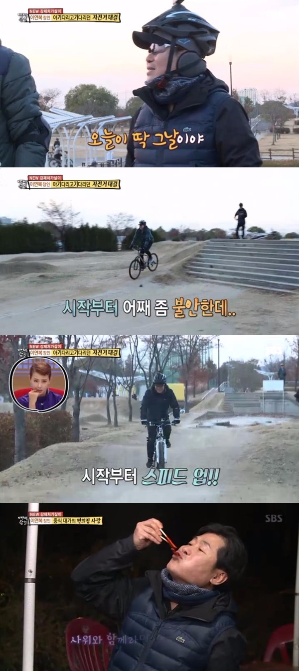이미지 확대보기30일 SBS ´자기야´에서는 이연복 셰프와 사위가 서로 하루를 함께 하는 모습이 방송됐다. 이 연복은 사위와 공원에서 운동을 하며 함께 시간을 보냈다. 사위와의 운동 기구 하기 대결에서 진 이연복 자신 있는 자전거 대결을 제안했다.