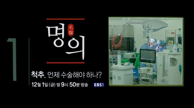 한편 EBS 1TV ‘명의’ 539회 <척추, 언제 수술해야 하나? – 척추관협착증, 허리디스크(추간판탈출증)> 편은 12월 1일(금요일) 밤 9시 50분 방송된다. 그리고 오는 12월 3일(일요일) 낮 12시 20분 EBS 1TV ‘명의’ 재방송으로 다시 볼 수 있다.