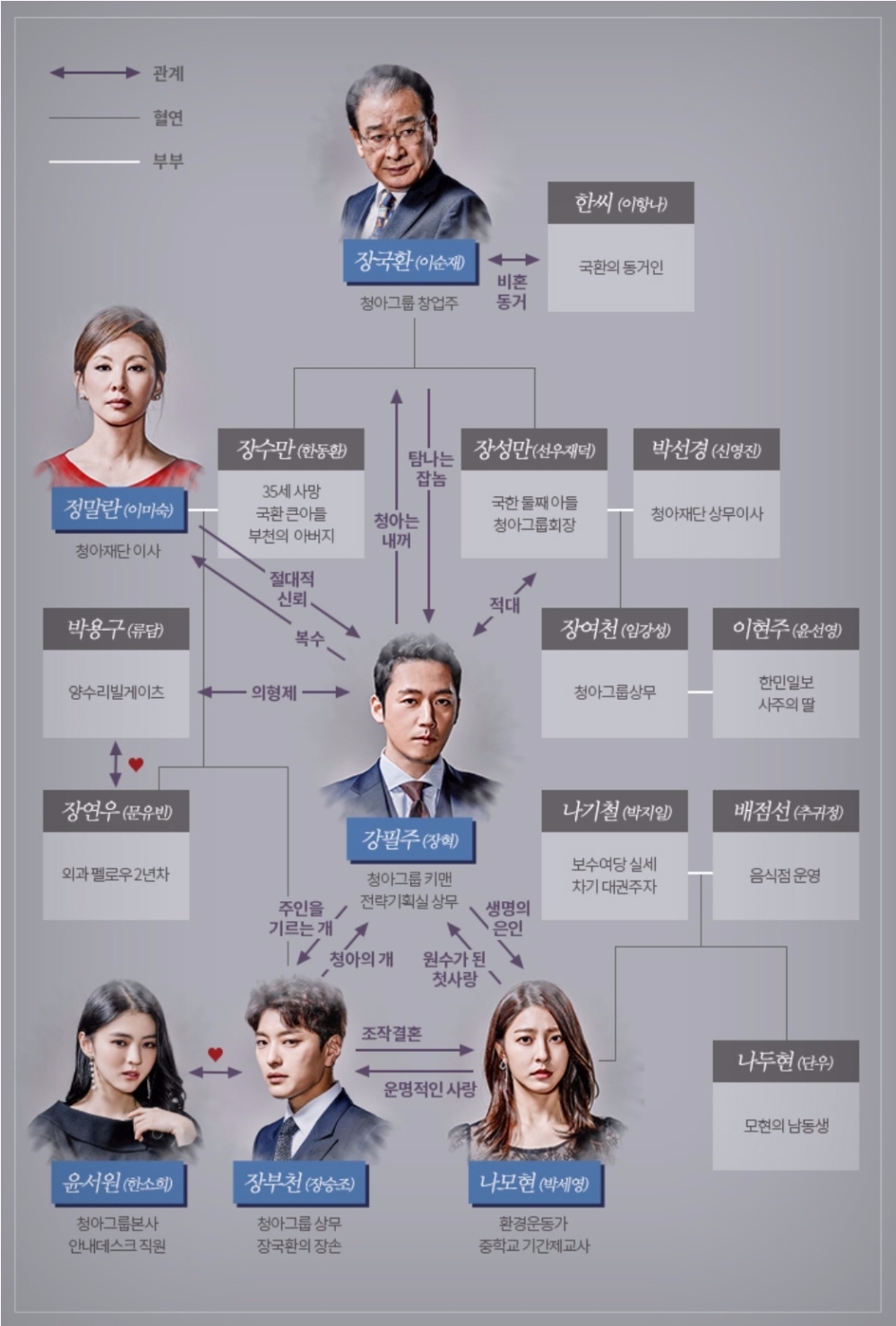 앞서 정말란은 강필주가 죽은 남편 장수만(한동환 분)의 혼외자 장은천으로 의심하고 오랫동안 개인비서로 지낸 오비서(박정학 분)를 시켜 유전자검사를 의뢰했다. 강필주는 그동안 장은천이라는 자신의 정체를 철저하게 숨기고 청아그룹을 먹기 위해 정말란 밑에서 힘을 키워왔다.
