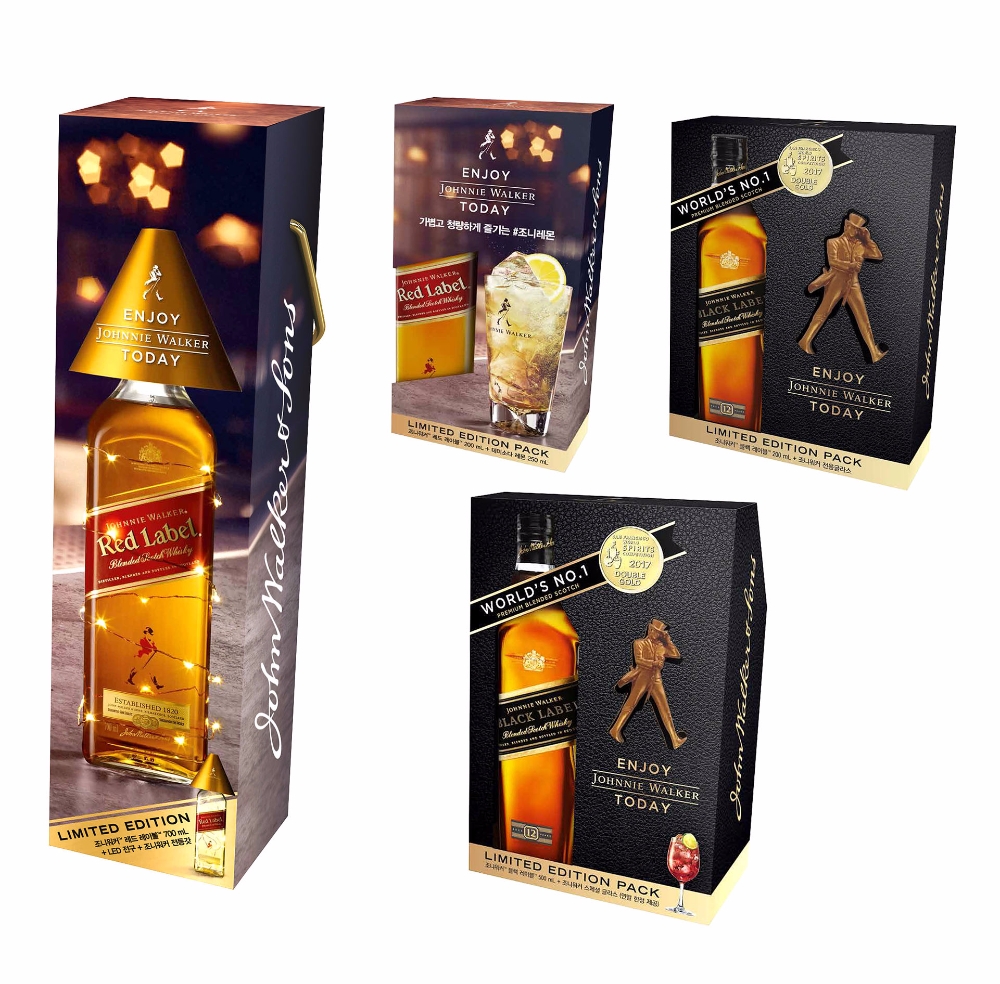 조니워커가 새롭게 선보이는 크리스마스 한정판은 라벨과 용량에 따라 4종류로 구성된다. 조니워커 레드 레이블700ml 패키지는 조니워커 병을 무드 등으로 재활용할 수 있도록 LED램프와 함께 전등갓이 포함됐다. 다 마신 병 내부 또는 외부에 LED램프을 장식하고, 포함돼 있는 전등갓을 장착하면 크리스마스 트리를 연상시키는 무드 있는 조명으로 변신한다. 소용량인 블랙 레이블 200ml 패키지에는 스트라이딩맨 모형과 조니워커 전용 샷잔2개가 함께 구성됐다.