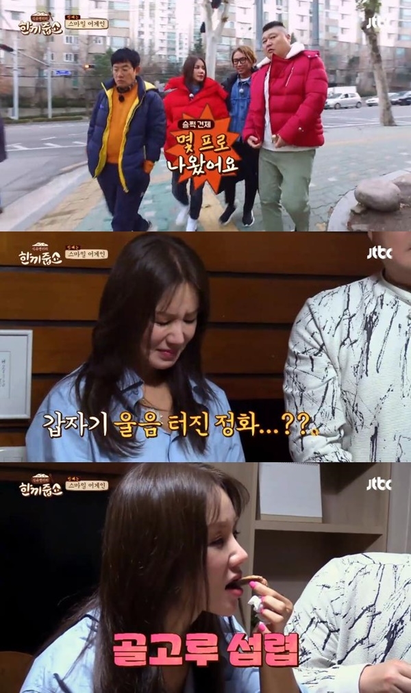 엄정화는 식사가 다 차려지고 가족끼리 카메라가 없다고 생각하고 대화를 나누는 시간인 ‘한끼극장’이 시작되자마자 뒤로 돌아 울기도 했다. 어릴 때 아버지가 일찍 돌아가신 엄정화에게는 꿈같은 장면이었던 것. 엄정화는 음식을 맛있게 먹으며 가족들에게 고마움을 표시했다.