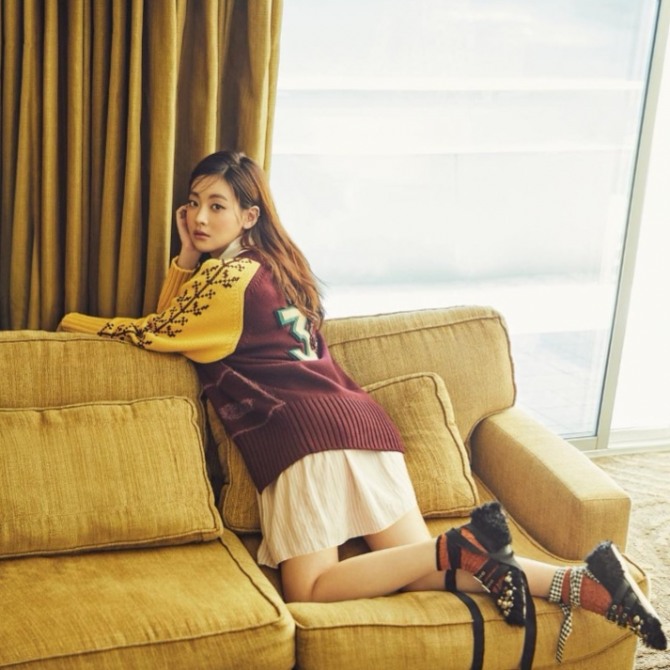 공개된 사진 속의 오연서는 브라운 칼라의 오버핏 니트에 짧은 아이보리 니트 스커트를 매치, 겨자색 계열의 소파에 올라가 뒤를 돌아보며 카메라를 응시하고 있다. 특히 오연서는 또렷한 이목구비의 청순미모가 돋보이는 작은 얼굴로 시선을 사로잡았다.