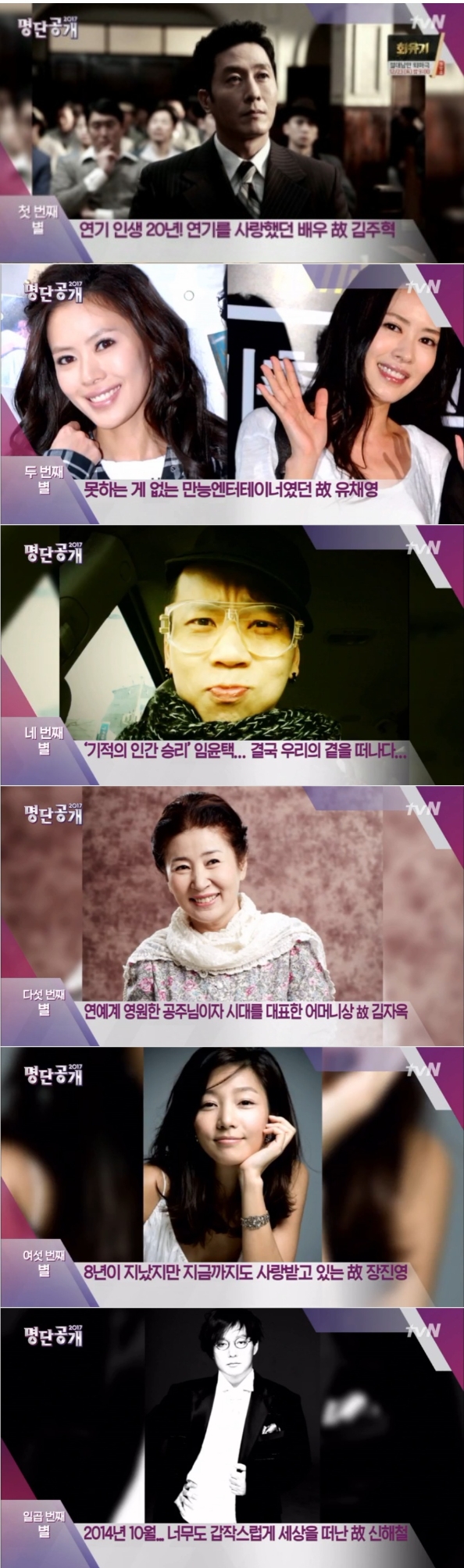 이날 소개된 스타는 故 김주혁, 유채영, 터틀맨 임성훈, 울라라세션 임윤택, 배우 김영애, 김자옥, 장진영, 고 신해철 등이었다.