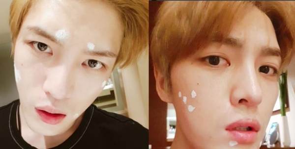 김재중은 지난 9일에도 볼 곳곳에 여드름 소독약을 바르고 “우 사춘기 어서 끝나라”는 글을 올리기도 했다.