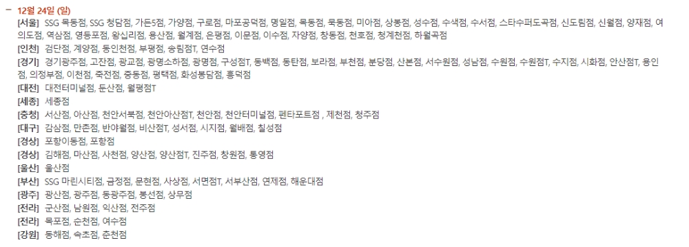 대구지역의 감삼점, 만촌점, 반야월점, 비산점T, 성서점, 시지점, 월배점, 칠성점이 휴무하며, 경상지역의 포항이동점, 포항점, 경상지역의 김해점, 마산점, 사천점, 양산점, 양산점T, 진주점, 창원점, 통영점, 울산지역의 울산점, 부산지역의 SSG 마린시티점, 금정점, 문현점, 사상점, 서면점T, 서부산점, 연제점, 해운대점도 휴무다.