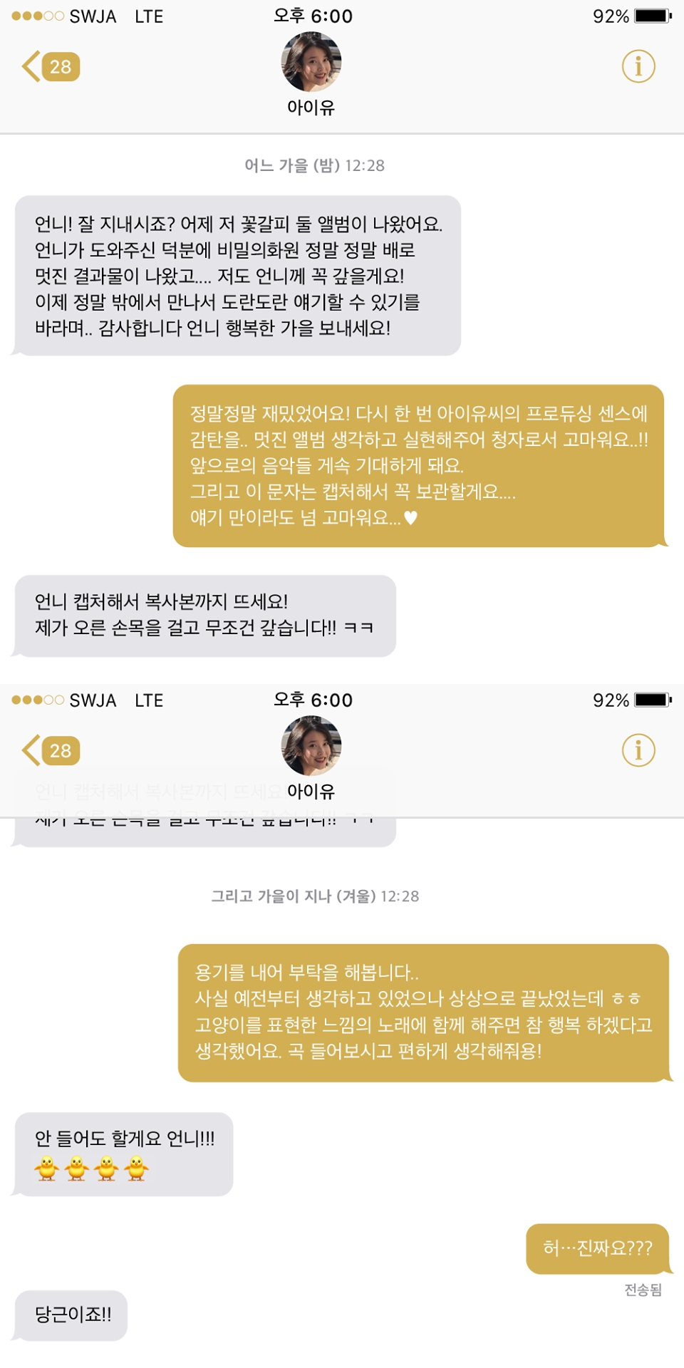 문자에서 아이유는 "어제 저 꽃갈피 둘 앨범이 나왔다"며 "언니가 도와주신 덕분에 비밀의 화원 정말 정말 배로 멋진 결과물이 나왔다"고 했다.