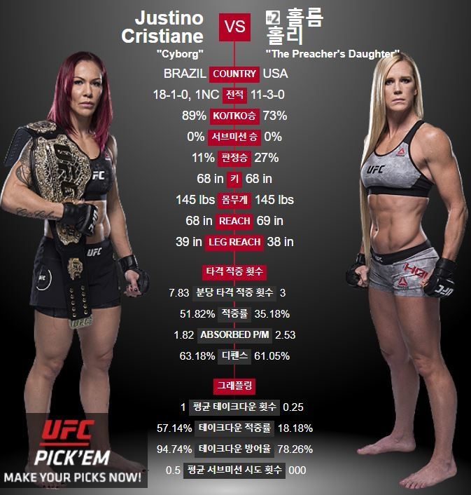 지난 2005년부터 무패 행진을 이어가는 사이보그는 UFC 포함 18승 1패 1무효를 기록 중인 선수다. 지난 7월 토냐 어빈저를 꺽고 페더급 챔피언에 올랐다.