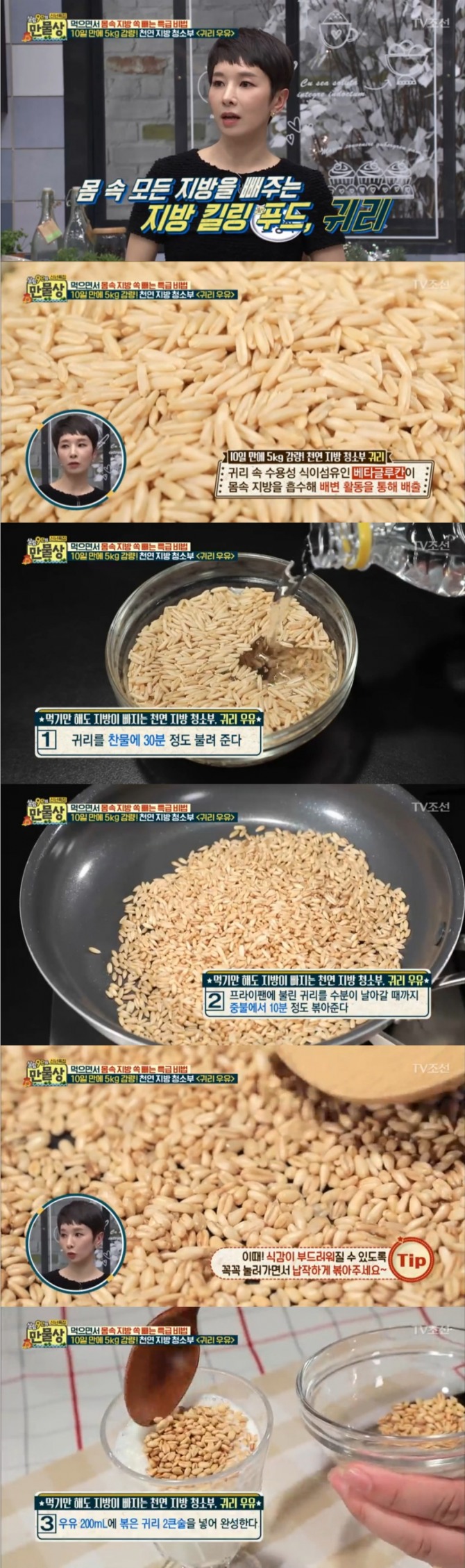 고정아 전문의는 천연지방 청소부로 귀리를 소개했다. 귀리 속 수용성 식이섬유인 베타글루칸이 몸속 지방을 흡수해 배변활동을 통해 몸 밖으로 배출시키는 역할을 한다는 것. 베타글루칸은 우유를 만나면 끈적한 상태로 변화되어 25배 정도 불어나 포만감을 상승시켜준다.