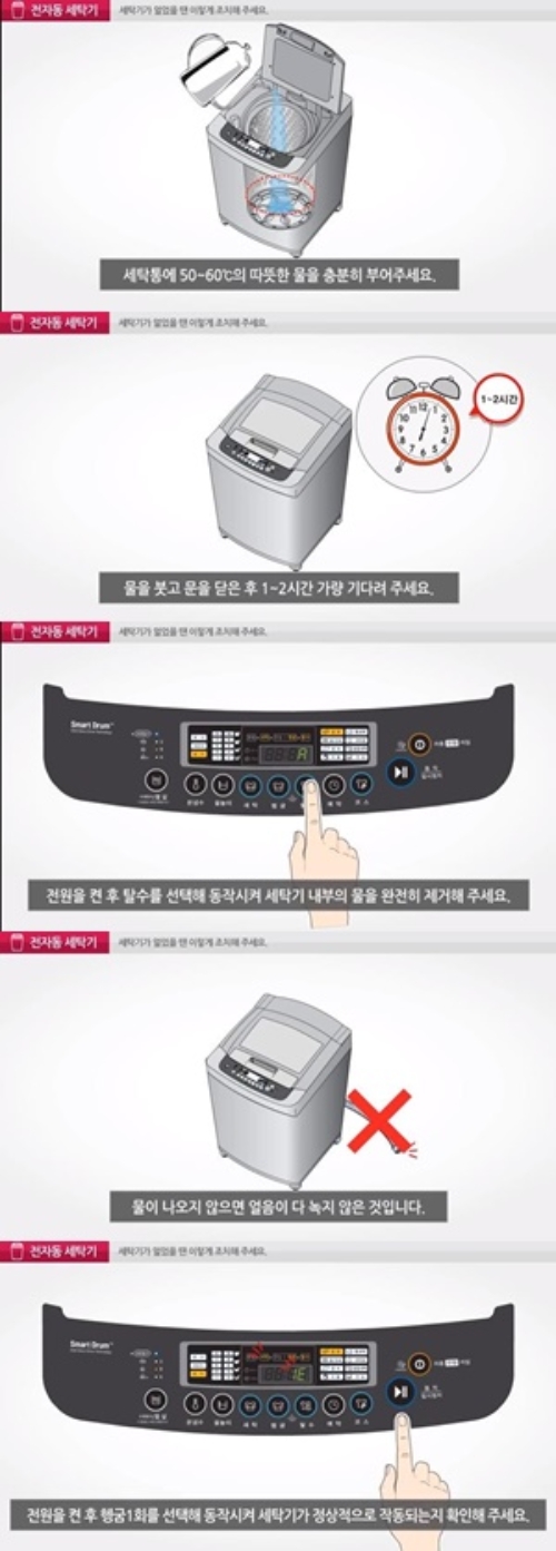 이런 경우에 대비해 세탁기가 얼었을 때 대처법이 관심을 끌고 있다. LG전자 홈페이지에는 세탁기가 얼었을 때 대처법을 통돌이 세탁기와 드럼 세탁기로 나뉘어 자세히 소개돼 있다.