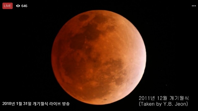 이미지 확대보기한국천문연구원의 개기월식 생중계는 페이스북 페이지를 통해 생중계 중이다. 단 오후 9시 34분 현재 기상악화로 지난 2011년 12월 개기월식 영상을 중계하고 있다.
