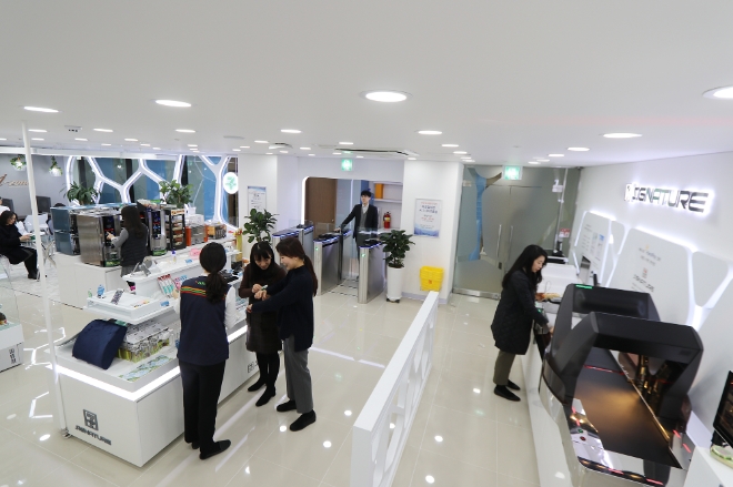 우선 핸드페이, 360도 자동스캔 무인 계산대, 바이오 인식 스피드 게이트, 스마트 CCTV 등 세븐일레븐 시그니처의 핵심 기술이 모두 적용됐다. 그리고 카페형 문화 공간을 구성해 약 20석의 휴게 공간과 함께 혼밥족을 위한 아이존(i zone)과 나눔 북스(Books) 코너 등을 갖췄다.