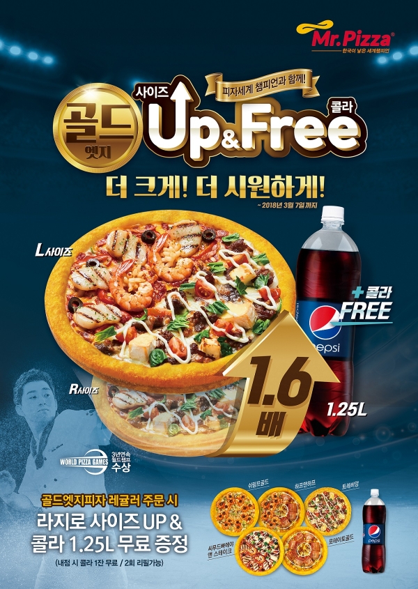 MP그룹의 미스터피자가 승리를 향한 국민적 염원을 담아 프리미엄피자 ‘골드엣지 Up&Free’ 프로모션을 진행한다. 미스터피자는 1일부터 다음달 7일까지 프리미엄피자 5종에 대해 레귤러 사이즈를 주문하면 1.6배 큰 라지 사이즈로 업그레이드해 주고, 콜라 1.25L를 무료로 제공한다. 내점 고객에게는 사이즈 업그레이드와 콜라 1잔을 무료(2회 리필 가능)로 제공한다.