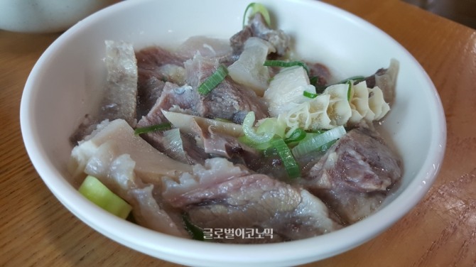 소박해 보이는 상차림은 간결했다. 파가 듬뿍 올라가 있는 뽀얀 곰탕 국물은 꾸밈없는 맛이었다. 먹을수록 담백하면서 구수한 맛은 입안에 흔적을 남겼다. 특히 대파가 듬뿍 담겨서인지 국물 맛은 느끼하지 않고 산뜻했다. 그리고 곰탕에 들어가 있는 부위는 꽤 다양했다.