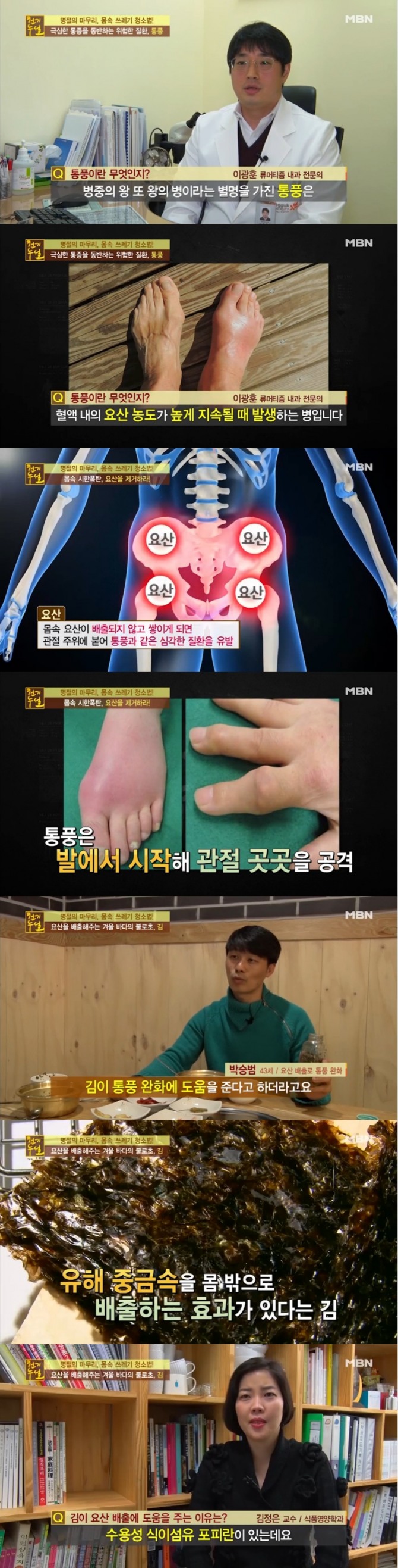 이미지 확대보기18일 저녁 방송된 MBN '천기누설'에서는 '몸속 쓰레기 청소법'으로 김을 이용해 요산을 배출하는 방법과 겨울냉이로 만성염증을 잡는 법, 갱년기 뼈건강에 도움이 되는 푸룬 섭취방법 등이 공개됐다.