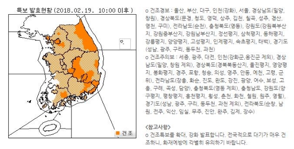 기상청은 서울, 울산, 부산을 비롯해 전국 대부분의 지역에 건조경보와 건조주의보를 발효한 상태다. 전국적으로 대기가 건조해 곳곳에 화재가 발생하는 경우가 많아 각별한 주의가 요구된다.