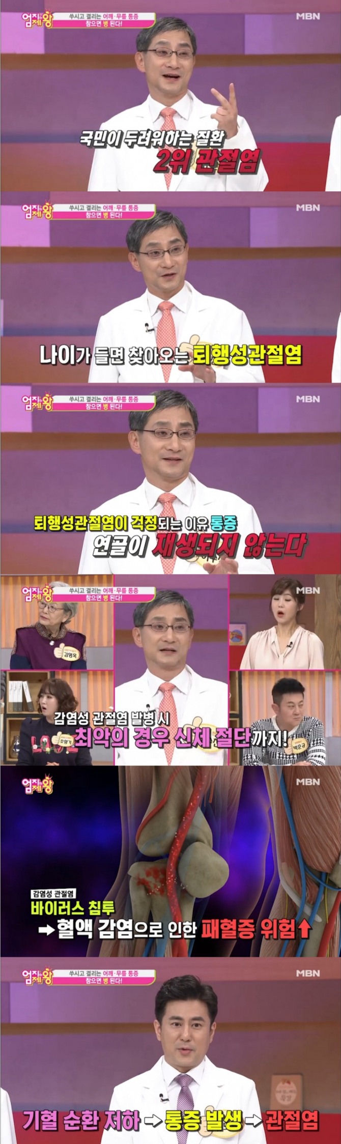 이미지 확대보기20일 밤 방송된 MBN '엄지의 제왕' 267회에서는 '관절 건강이 내 삶을 좌우한다?!' 특집으로 이수찬 정형외과 전문의와 류도근 한의사가 출연해 건강 꿀팁을 제공했다.