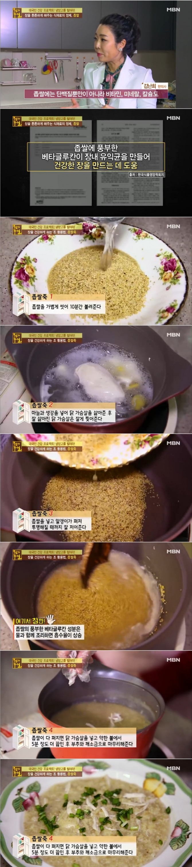 이미지 확대보기4일 방송된 종합편성채널 MBN 천기누설 300회에서는 돌연사를 부르는 나쁜 피를 해독하라 특집이 전파를 탄 가운데 김난희 한의사가 만성장염을 한방에 날려줄 최고의 간식으로 좁쌀전과 좁쌀차를 소개했다.