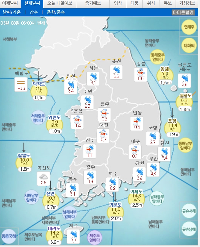 낮 최고기온은 ▲서울·경기 8도 ▲강원영서 7도 ▲강원영동 3도 ▲충남 5도 ▲충북 4도 ▲경북 4도 ▲전남 5도 ▲전북 5도 ▲경남 7도 ▲제주 8도 ▲백령 1도 ▲울릉·독도 5도이다