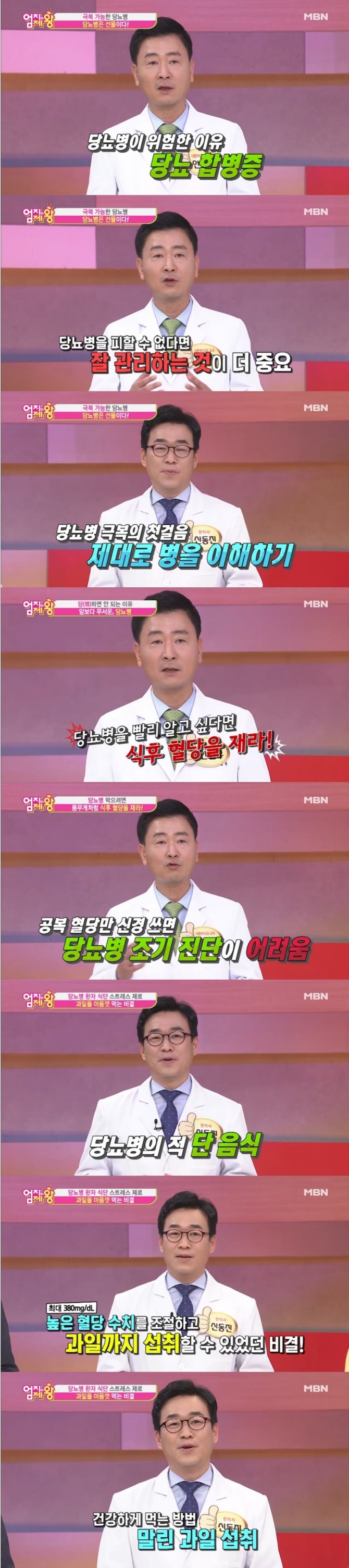 신동진 한의사는 "당뇨인데 단 음식을 무조건 참으면 스트레스가 온다"며 과일을 먹으면서 당뇨를 조절했다고 본인의 체험 사례를 밝혔다.