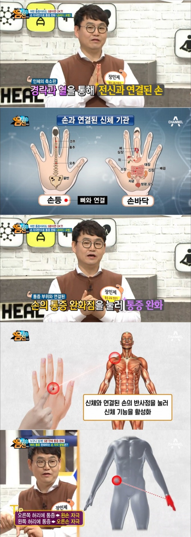 따라서 몸 어딘가에 통증이 발생하면 통증부위와 연결된 손의 통증 완화점을 눌러 통증을 완화시킬 수 있다는 것.