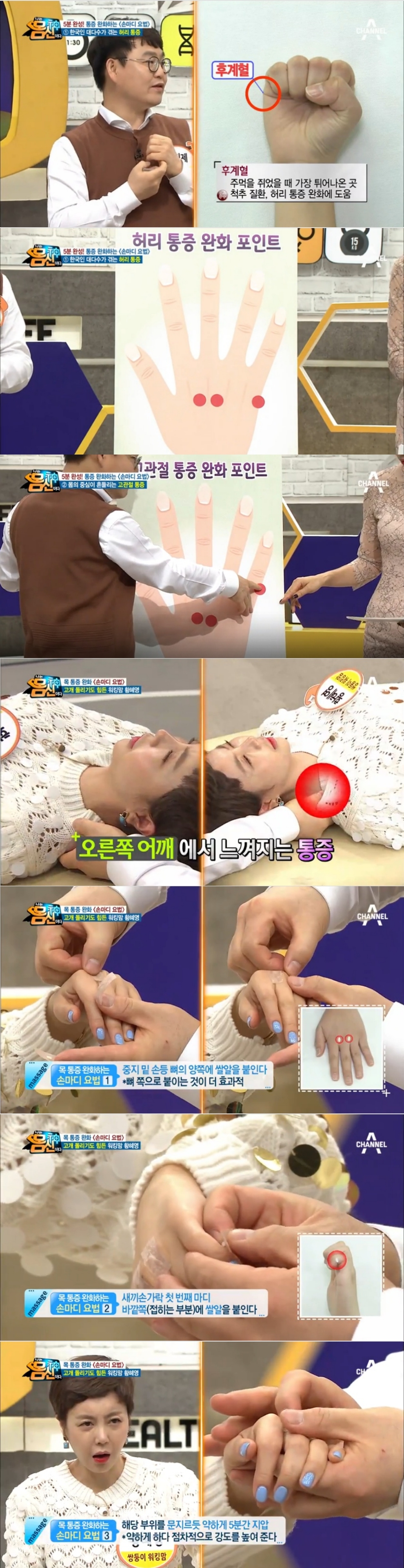 황혜영은 오른쪽 목 통증 완화하는 테이프 요법으로 먼저, 왼쪽 손 가운데 손가락(중지) 밑 손등 뼈의 양쪽에 쌀알을 놓고 테이프를 붙였다. 이 때 테이프는 뼈 쪽으로 붙이는 것에 더욱 효과적이다.