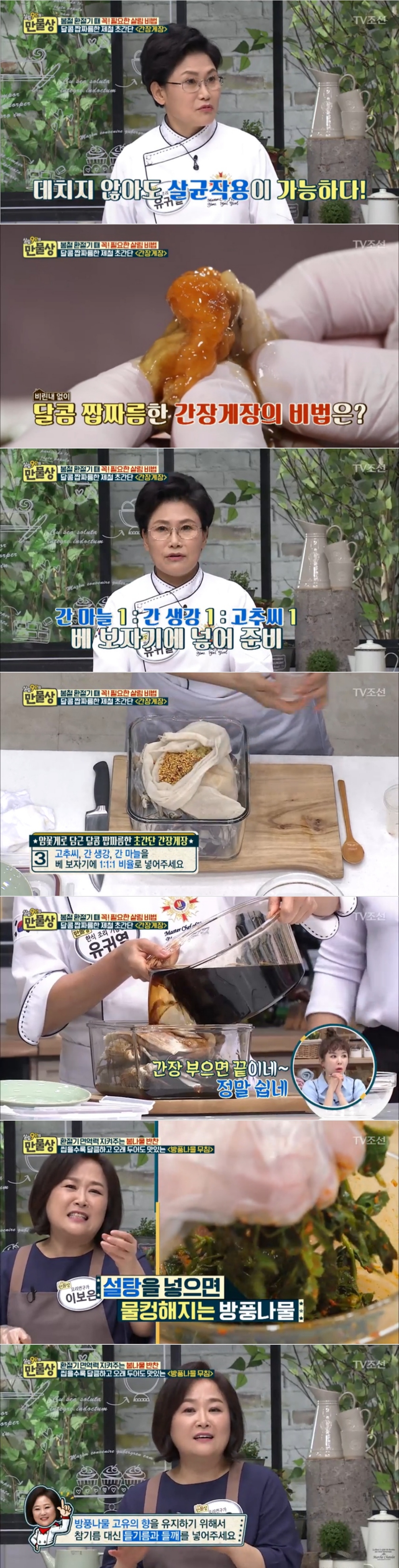 유귀열 기능장이 소개한 영양가 최고 제철 식품 꽃게로 만든 간장게장과 꽃게탕 만드는 법과 이보은 요리연구가가 공개한 방풍나물무침, 마늘종뱅어포볶음 만드는 법은 다음과 같다.