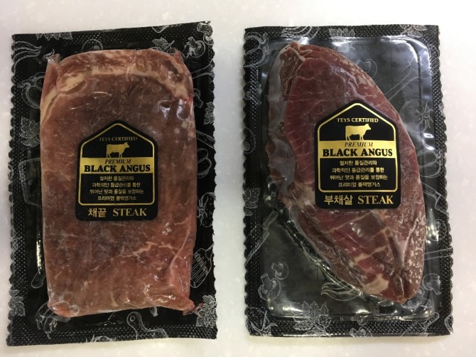 이미지 확대보기저울에 무게를 달아보니 채끝살은 162g, 부챗살은 180g이 나와 표시된 중량보다 무거웠다. 하지만 색은 달랐다. 마케팅 이미지 속 고기는 골고루 지방이 퍼진 선홍빛이었다. 실제 제품은 딴판이었다. 거무스름한 빛이 돌았다. 채끝살은 지방이 한쪽으로 쏠려 있었고, 부챗살은 살코기에 가까웠다.