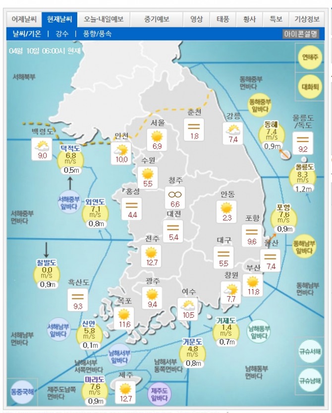 아침 최저기온은 서울 3도 대전 5도 대구 6도 전주 6도 광주 6도 부산 9도 춘천 -1도 강릉 4도 제주 13도 울릉도·독도 5도 등이다.