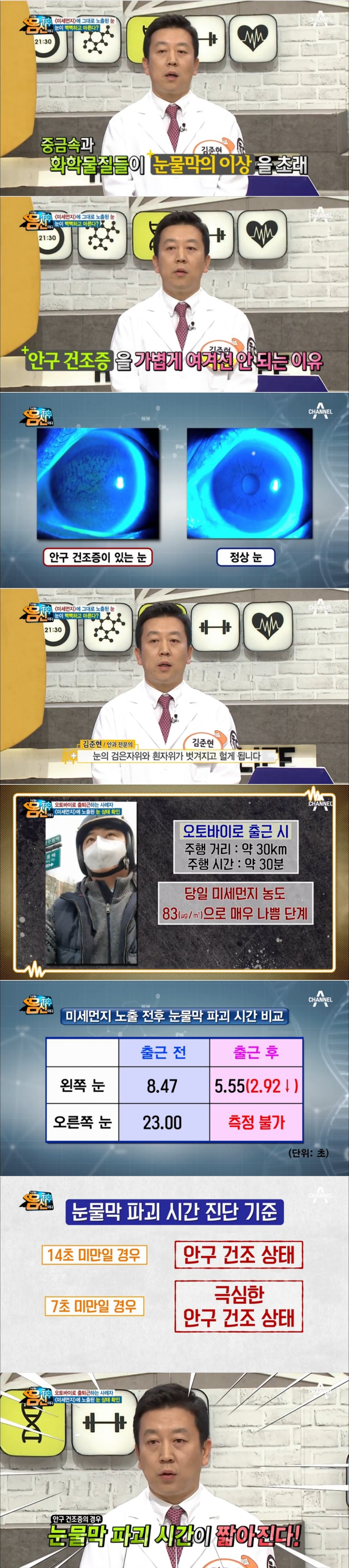 미세먼지가 나쁜 날 오토바이로 30분 출근한 사례자의 경우 눈물막 파괴검사를 실시한 결과 출근 전 왼쪽 눈 8.47초에서 출근후 5.55초로 2.92초가 낮아졌다. 오른쪽 눈의 경우 출근 전 23.00초에서 출근 후 측정불가로 나타나 충격을 안겼다.