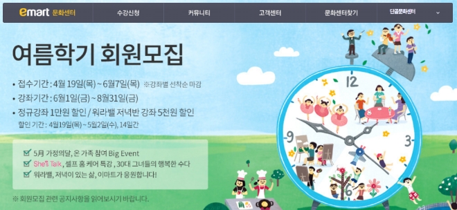 이번 여름학기는 6월 1일 부터 8월 31일까지 진행된다. 각 점포 문화센터를 방문하거나, 인터넷(culture.emart.com)이나 모바일 사이트에 접속해 접수하면 된다. 각 점포 문화센터 안내데스크에서 강좌에 대한 안내를 받을 수 있다.