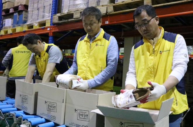 이미지 확대보기CJ제일제당은 신현재 대표와 강신호 대표를 비롯한 임직원 50명이 ‘푸드뱅크 희망나눔 선물세트’ 조립 봉사활동을 진행했다. ‘푸드뱅크 희망나눔 선물세트’ 조립 봉사활동은 생필품 선물세트를 조립해 푸드뱅크에 기부하고 이를 저소득층에 전달하는 사회공헌활동이다. 신현재 대표 등 CJ제일제당 임직원들은 지난 23일 서울 도봉구에 위치한 서울광역푸드뱅크에서 CJ제일제당 제품으로 이뤄진 ‘희망나눔 선물세트’ 총 3000세트를 조립했다. ‘희망나눔 선물세트’는 설탕, 밀가루, 식용유, 고추장 등 기초 소재 식품으로 구성됐으며 4인 가족이 약 3개월 간 먹을 수 있는 분량이다.