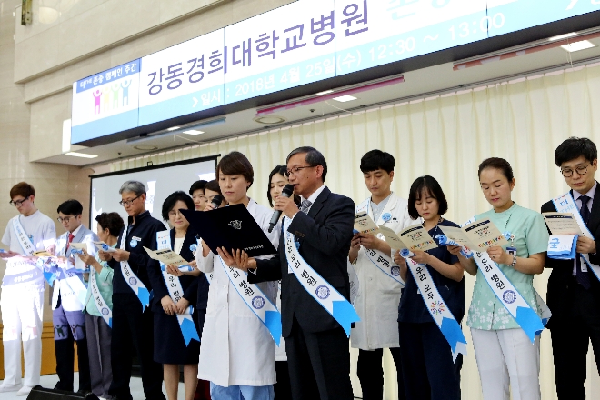 이미지 확대보기대학병원은 의사, 간호사부터 임상병리사, 방사선사, 행정직원까지 다양한 직종이 함께 근무하는 만큼 직종 간, 직원 간 상호 배려와 존중은 더욱 중요하다. 강동경희대병원 ‘더(The) 존중 캠페인’은 ‘더 존중, 더 배려, 더 이해, 더 소중’ 총 4개의 실천약속을 통해 최근 화두가 되고 있는 직장 내 갑질·서열 문화를 타파하고, 성숙하고 건전한 직장문화 형성을 위해 기획됐다.