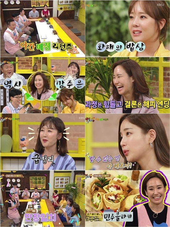 이날 '해투3'는 가정의 달 두 번째 특집 '야간 매점 리턴즈'로 꾸며졌다. 이 가운데 소유진-강주은-별-기은세가 출연해 남편을 휘어잡은 카리스마를 폭발시켜 대찬 입담을 쏟아낸 데 이어, 야간 매점 명예의 전당 자리를 놓고 치열한 야식 배틀을 펼치며 시청자들의 웃음보를 터뜨렸다.