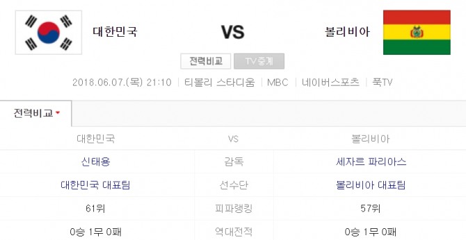 이미지 확대보기신태용 감독이 이끄는 한국 축구대표팀이 7일 오후 9시 10분(이하 한국시간) 오스트리아 인스부르크의 티볼리 스타디움에서 볼리비와 평가전을 갖는다.볼리비아는 5월 FIFA 랭킹 57위로 61위인 한국보다 4계단 높다. 한국과 볼리비아의 역대 전적은 1무승부다. 한국은 김호 감독이 지휘했던 1994년 미국 월드컵 조별예선에서 볼리비아와 격돌, 0-0으로 비긴 바 있다. 볼리비아는 러시아 월드컵 남미 예선에서 4승2무12패(승점 14)로 10개 팀 가운데 9위에 머물면서 본선 진출에 실패했다. 남미 지역에서 약체로 꼽한다. 하지만 수비를 단단히 한 뒤 펼치는 역습은 위협적이다. 또 남미 특유의 개인기와 고지대를 홈으로 하는 선수들인 만큼 체력이 뛰어나다. 한국이 가장 경계해야할 부분이다.이런 볼리비아를 대적하기 위해 한국은 손흥민(토트넘)-황희찬(잘츠부르크) 투톱을 준비했다.