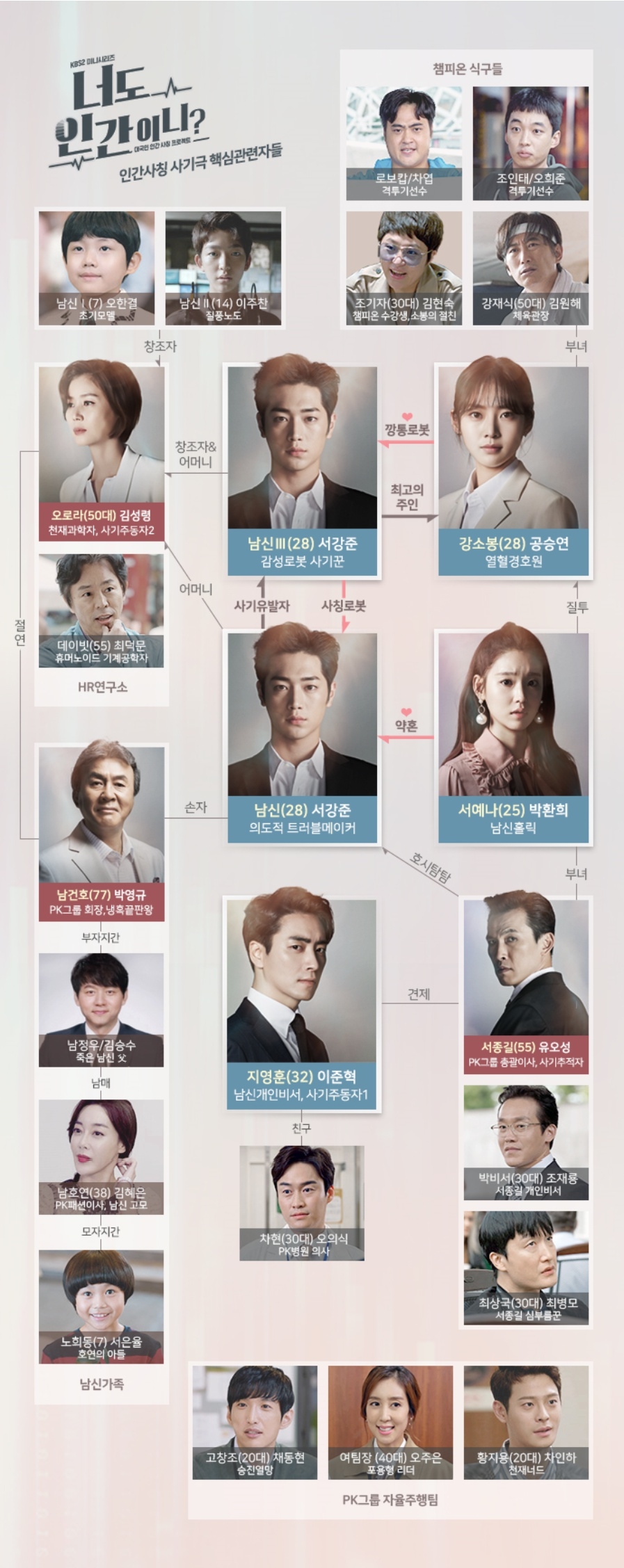 인물관계도 한 가운데는 인공지능 로봇 남신Ⅲ 역의 서강준과 경호원 강소봉 역의 공승연에 자리잡고 있다. 남신Ⅲ은 '울면 안아줘야 한다'는 명령어가 입력된 감성로봇. 체코에서 극중 서종길(유오성 분)의 사주를 받아 의식불명이 된 남신(서강준 분) 대신 사태를 수습하러 서울에 온 남신Ⅲ은 자율주행차 시연회장에 참석, 불길이 치솟는 절체절명의 클럽화재 현장에서 강소봉을 구출해 긴장감을 선사했다.