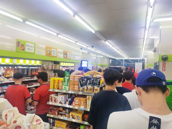 다른 편의점 업체 매출도 비슷한 양상을 보였다. 시청과 광화문 근처에 있는 세븐일레븐 매장 10여곳에서는 맥주 매출이 지난해 같은 날보다 3294.1% 치솟았다. 전체 매출도 463.1% 올랐다. 거리 응원전이 펼쳐진 장소 주변 GS25 매장 10곳에서도 맥주(847.3%)와 안주류(253.6%) 등의 매출이 상승했다.