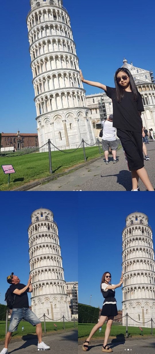한수민은 "피사의 사탑 #박명수 #한수민 #박민서"라는 태그를 달고 사진 3장을 게시했다. 피사의 사탑 앞에서 각기 다른 포즈를 취한 한수민과 남편 박명수, 그리고 딸 민서 양의 모습이다.