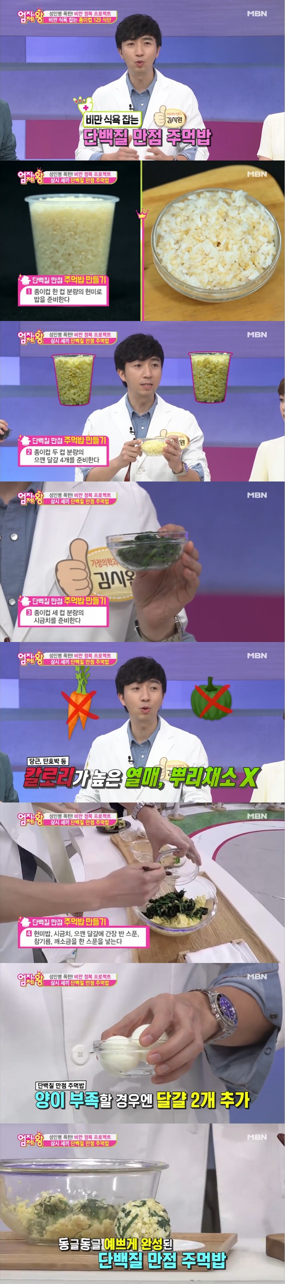 김시완 전문의는 현미와 삶은 계란, 시금치 등으로 만든 단백질 주먹밥으로 2주 동안 6kg감량한 식단을 선보여 감탄을 자아냈다.