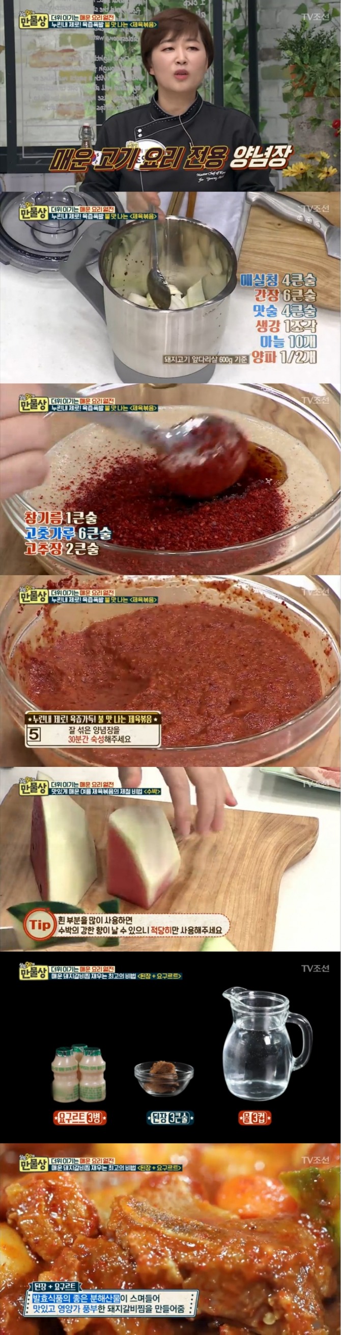 이날 조영신 기능장은 '매운 고기요리 전용 만능양념장' 레시피와 함께 '제육볶음' 비법으로 수박즙에 돼지고기를 재우는 법과, '매운돼지갈비찜' 레시피로 돼지갈비를 요구르트에 재워 냄새를 잡고 연육작용을 동시에 하는 비법을 공개해 눈길을 끌었다.
