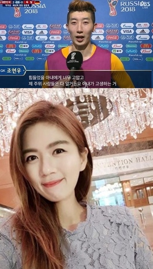 조현우는 앞서 27일(현지시간) 러시아 카잔 아레나에서 열린 2018 러시아 월드컵 조별리그 F조 최종전을 끝낸 뒤 가진 언론 인터뷰에서 "제 주위 사람들은 아내가 고생하는 걸 다 안다"며 "힘들었을 아내에게 너무 고맙다"고 아내에 대한 고마움을 드러냈다.