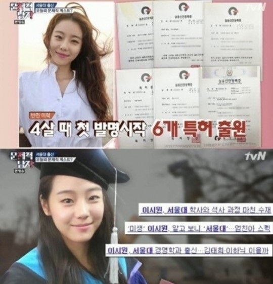 이시원은 서울대 진화심리학 전공에 총 6개의 발명품 특허 출원 사실을 고백했다. 이 외에도 과학 발명대회, 수학경시대회 등 수상 이력을 공개해 놀라움을 자아냈다.