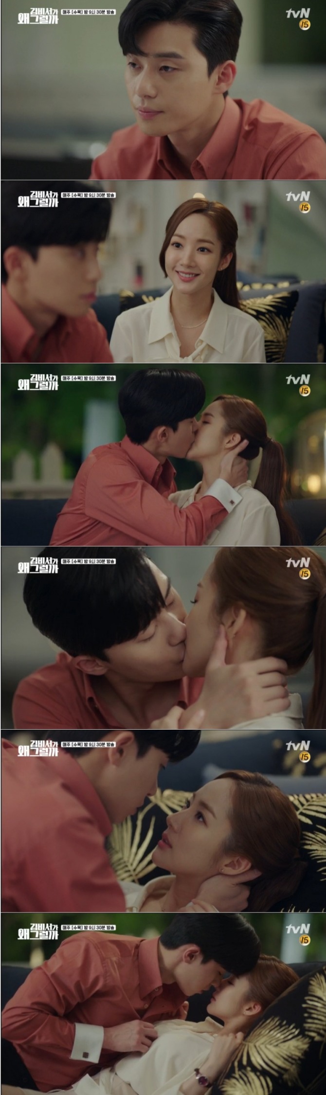 이미지 확대보기12일 방송된 tvN 수목드라마 '김비서가 왜 그럴까'(극본 백선우·최보림, 연출 박준화) 12회에서는 이영준(이성현, 박서준 분)과 김미소(박민영 분)가 답키스까지 진도가 훅 나가며 안방극장을 핑크빛으로 물둘였다.
