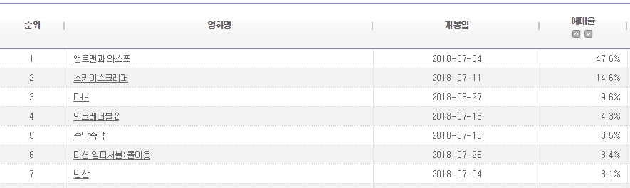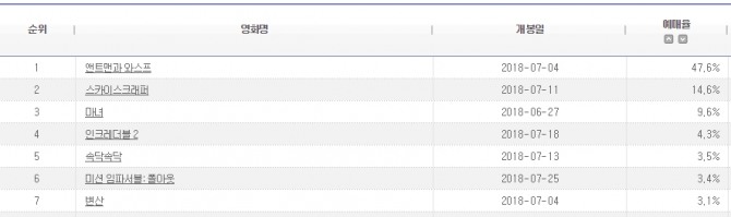 이미지 확대보기14일 영화진흥위원회 영화관입장권통합전산망에 따르면 실시간 예매율 1위를 기록하고 있는 영화는 '앤트맨과 와스프'였다. 예매율 47.6%, 누적 관객수는 351만6894명이다.