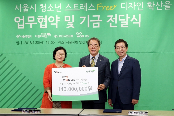 교원그룹은 20일 서울시청, 초록우산 어린이재단과 ‘스트레스 프리존’ 조성을 위한 공동협력 업무협약을 체결했다. 이번 협약을 통해 교원그룹은 창신초등학교 스트레스 프리존에 1억4000만원을 후원한다. 스트레스 프리존은 아이들이 건강한 정신을 가꿀 수 있는 교내 휴게 공간으로, 교원그룹 영어 학습 프로그램 ‘도요새 잉글리시 멤버스’ 캐릭터를 활용해 조성된다.