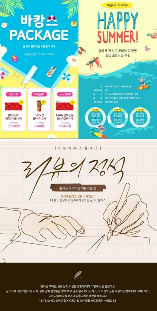 또한 8월 26일까지 전국 54곳 영화관에서 여름나기 프로젝트 'HAPPY SUMMER' 이벤트를 진행한다. 서로 다른 영화 두 편 이상 관람한 고객에게는 영화 2천원 할인권 12매와 콤보 2천원 할인권 6매를 제공한다. 쿠폰은 9월 1일 롯데시네마 ID로 지급되며, 11월까지 매월 사용 가능한 영화 할인권 4매와 콤보 2천원 할인권 2매가 증정된다.