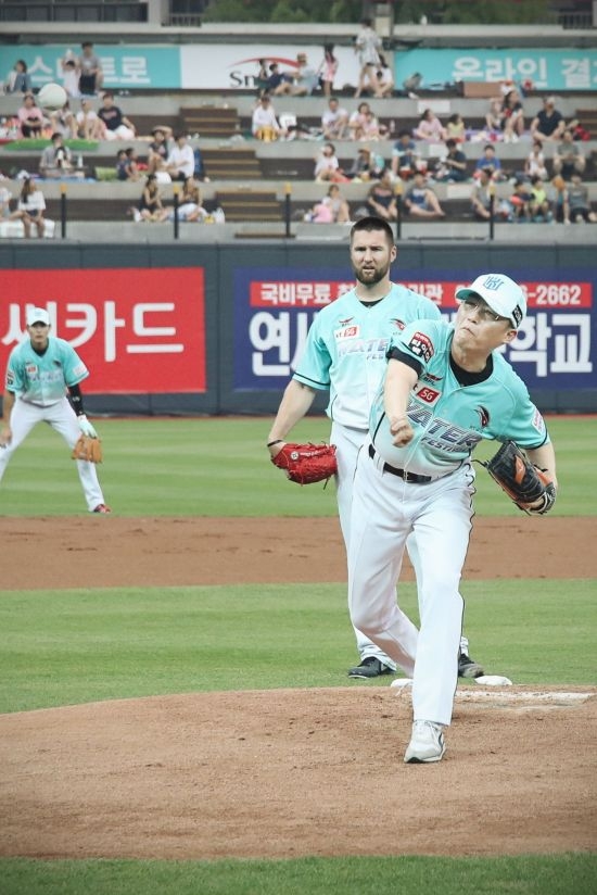 이국종 교수는 2시간 전부터 수원 KT 위즈파크를 찾아 시구 연습을 하며 열정적인 모습을 보였다.