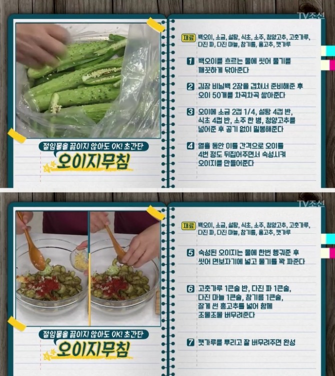 이미지 확대보기지난 5월 31일 방송된 TV조선 '살림9단의 만물상' 246회에서는 '6월 입맛 당기는 제철 밥상'을 주제로 이보은 요리연구가가 출연, 물을 넣지 않고 '오이지 담그는 법'과 '오이지무침' 레시피를 선보였다.