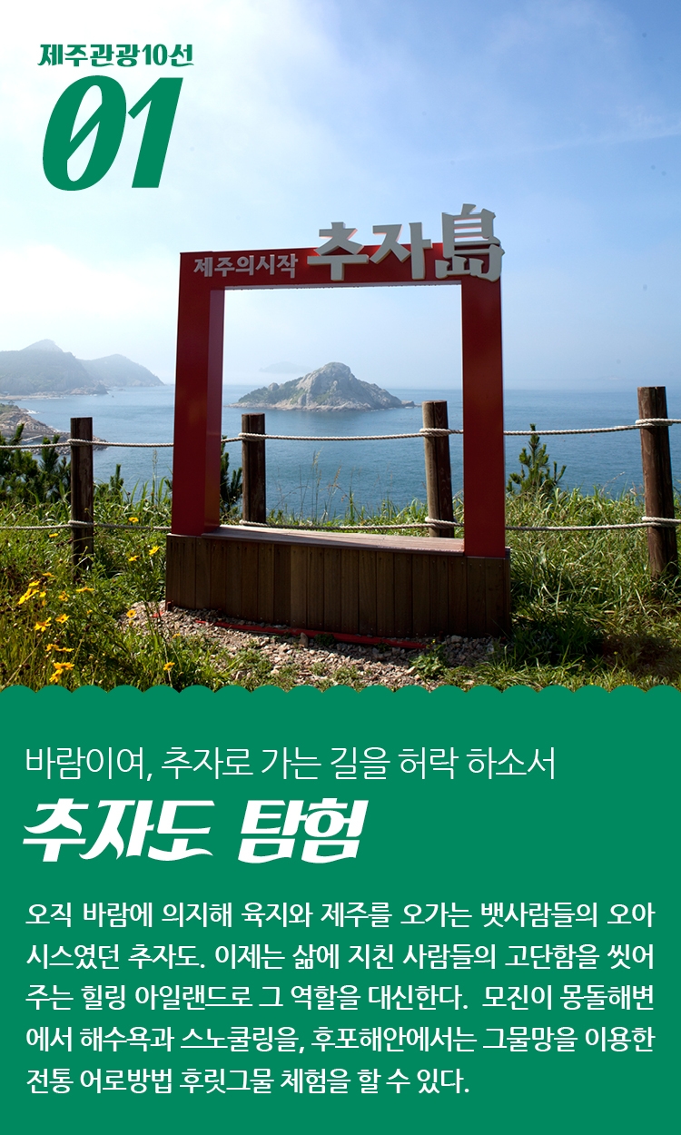 추자바다와 한바탕 신나게 놀았다면 세월의 흔적이 가득한 영흥리 골목 타일벽화와 추자의 빛깔을 닮은 색으로 채워진 추자초등학교에서 인생샷으로 추억을 남겨보길. 또한 용둠벙 전망대에는 아찔하게 솟은 나바론 절벽을 감상해보고, 밤이면 후포해안가를 걸으며 밤하늘의 별을 세어보며 어릴 적 순수했던 그 마음으로 되돌아가보자. 올 여름, 바람이 추자로 가는 길을 활짝 열어주길 바란다.