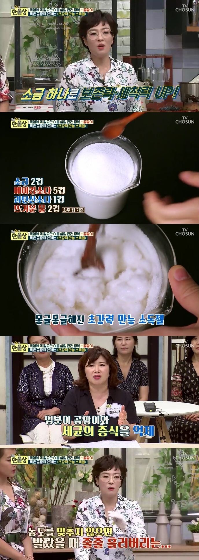 9일 방송된 TV조선 '살림9단의 만물상' 256회에서는 강혜정 청소전문가가 출연, 푹푹찌는 푹염에 늘어가는 곰팡이를 쉽게 제거할 수 있는 초강력 만능소독젤 만드는 법을 선보였다. 사진=TV저산 방송 캡처